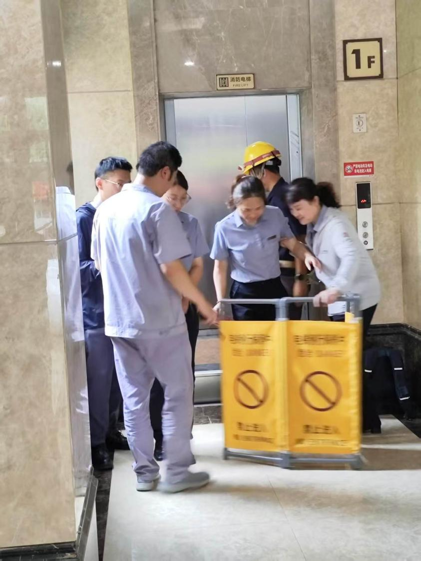 當接到電梯被困乘客的救援電話后,相關部門迅速反應,電梯維修(解困)人員第一時間趕赴現場。安全保衛(wèi)組快速行動,設置圍欄,劃定警戒區(qū)域,勸離無關人員,保障救援現場秩序與通道暢通。救援人員首先確定廳轎門全部關閉,并被困人員取得聯(lián)系,耐心溝通,告知對方保持冷靜,遠離轎門,等待救援。隨后,救援人員精準判斷轎廂位置。確定電梯轎廂地坎與廳門地坎接近平層,救援人員嚴格按照流程,先切斷主電源并進行鎖閉程序,再用廳門鑰匙打開廳轎門,成功釋放被困人員。之后,對被困人員進行安撫,并對電梯展開檢修。演練結束后特邀請日立電梯公司的工作人員為在場所有員工進行電梯知識科普。