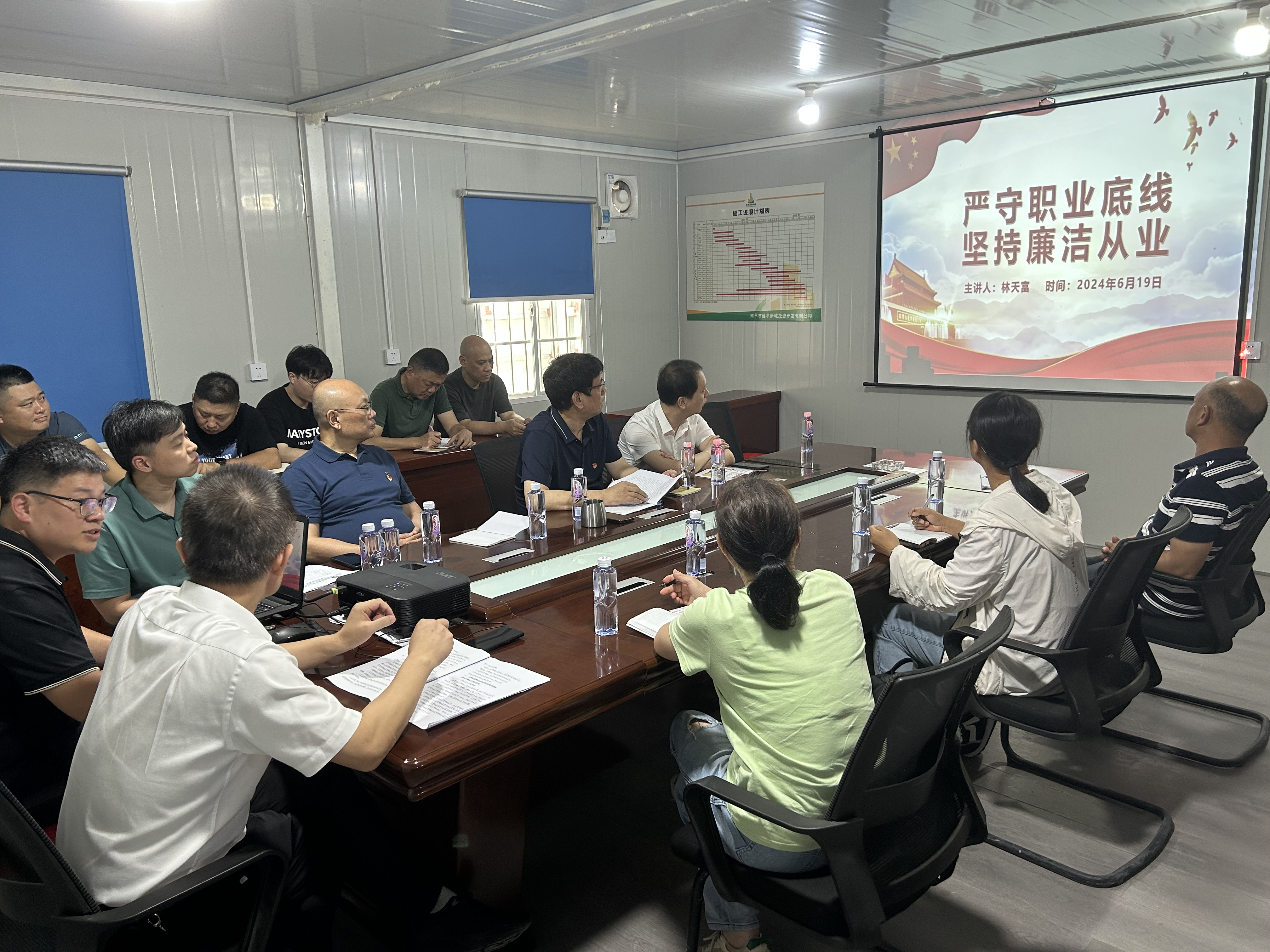 黨支部書記、董事長林天富同志以《嚴守職業(yè)底線 堅持廉潔從業(yè)》為主題,為大家上了一堂生動的警示教育課。他指出,工程項目要從嚴加強黨風廉政建設的宣傳教育,大力弘揚清正廉明的廉潔文化,加大工程項目監(jiān)督管理力度,充分發(fā)揮廣大群眾的監(jiān)督作用。他要求,項目一線員工要進一步提高認識,轉(zhuǎn)變作風,廉潔從業(yè);要認真履行崗位職責,恪守職業(yè)道德,決不以權謀私,不做有損單位利益和形象的事情。